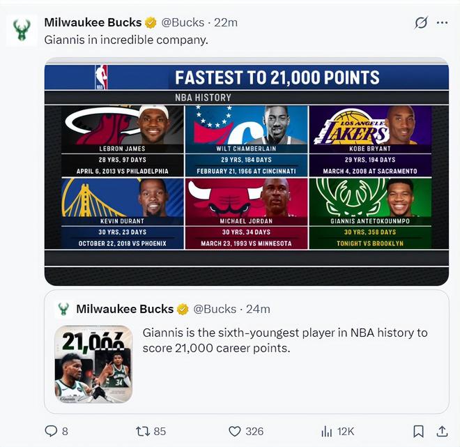 21000分之夜结束7连败!扬尼斯19分钟29+8早早打卡 雄鹿官方祝贺