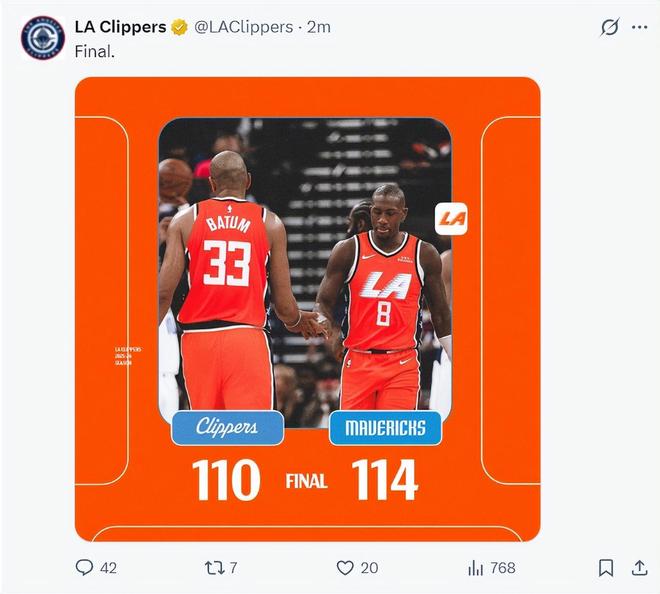 赛后快船记者Joey Linn写道:这支糟糕的快船队似乎又刷新了他们的下限,他们居然输给了阵容不整的独行侠,已经吞下一波四连败。莱昂纳德虽然发挥出色拿到30分,可他的登场时间被控制在30分钟以内,哈登则拿到29分11篮板8助攻。