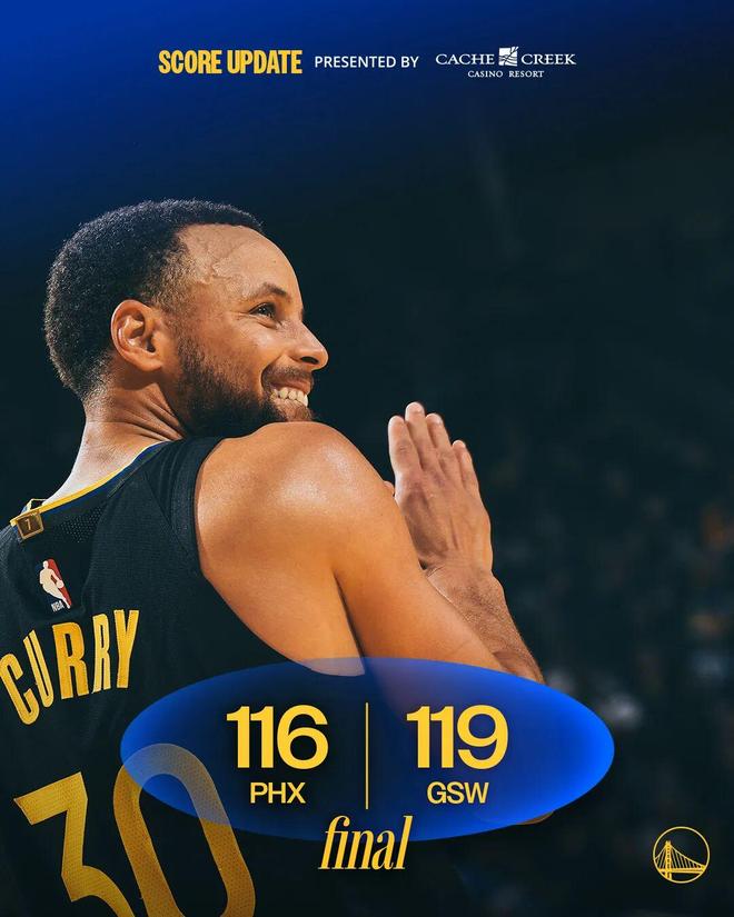 常规赛,勇士主场119-116战胜太阳,完成复仇的同时终结三连败。