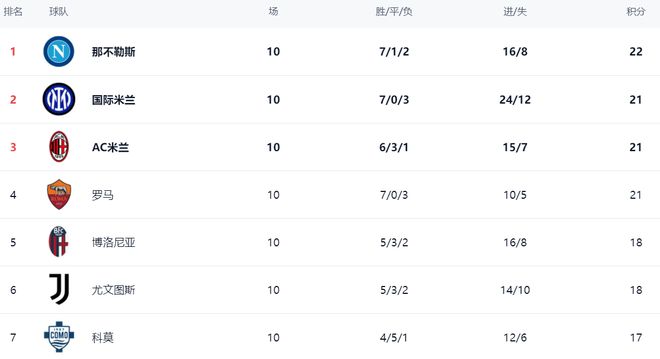 在积分榜上,那不勒斯依然占据榜首位置。那不勒斯7胜1平2负,拿到22分。不过,那不勒斯的领先优势很小。国际米兰、AC米兰和罗马都拿到21分。也就是说,前4差距最多只有1分,冠军的争夺非常激烈。每轮比赛过后都很可能导致榜首球队发生变化。博洛尼亚和尤文图斯都是18分,排名第5和第6。法布雷加斯率领的科莫拿到17分,排名第7。