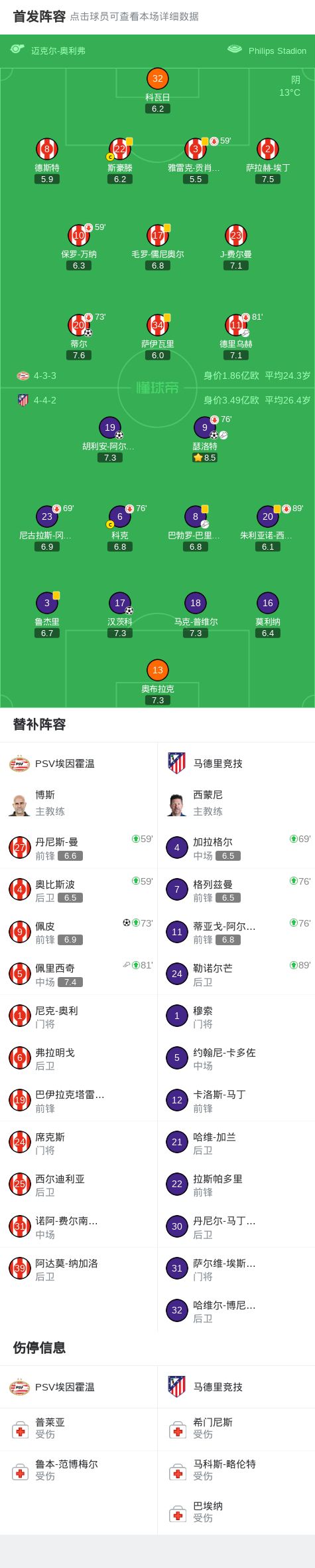 北京时间12月10日欧洲冠军联赛 联赛阶段 第6轮,PSV埃因霍温对阵马德里竞技。上半场,德里乌赫助攻蒂尔破门。瑟洛特无私横传,阿尔瓦雷斯扳平比分。下半场,莫利纳远射被扑,汉茨科补射建功。巴里奥斯传中,瑟洛特头槌破门。佩里西奇头球后蹭,佩皮扳回一城。全场比赛结束,马竞客场3-2击败埃因霍温。
