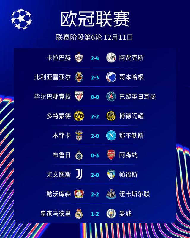至此,本赛季欧冠联赛阶段第6轮第二天的9场比赛战罢:卡拉巴赫2-4阿贾克斯、比利亚雷亚尔2-3哥本哈根、毕尔巴鄂竞技0-0巴黎圣日耳曼、多特蒙德2-2博德闪耀、本菲卡2-0那不勒斯、布鲁日0-3阿森纳、尤文图斯2-0帕福斯、勒沃库森2-2纽卡斯尔联、皇家马德里1-2曼城。